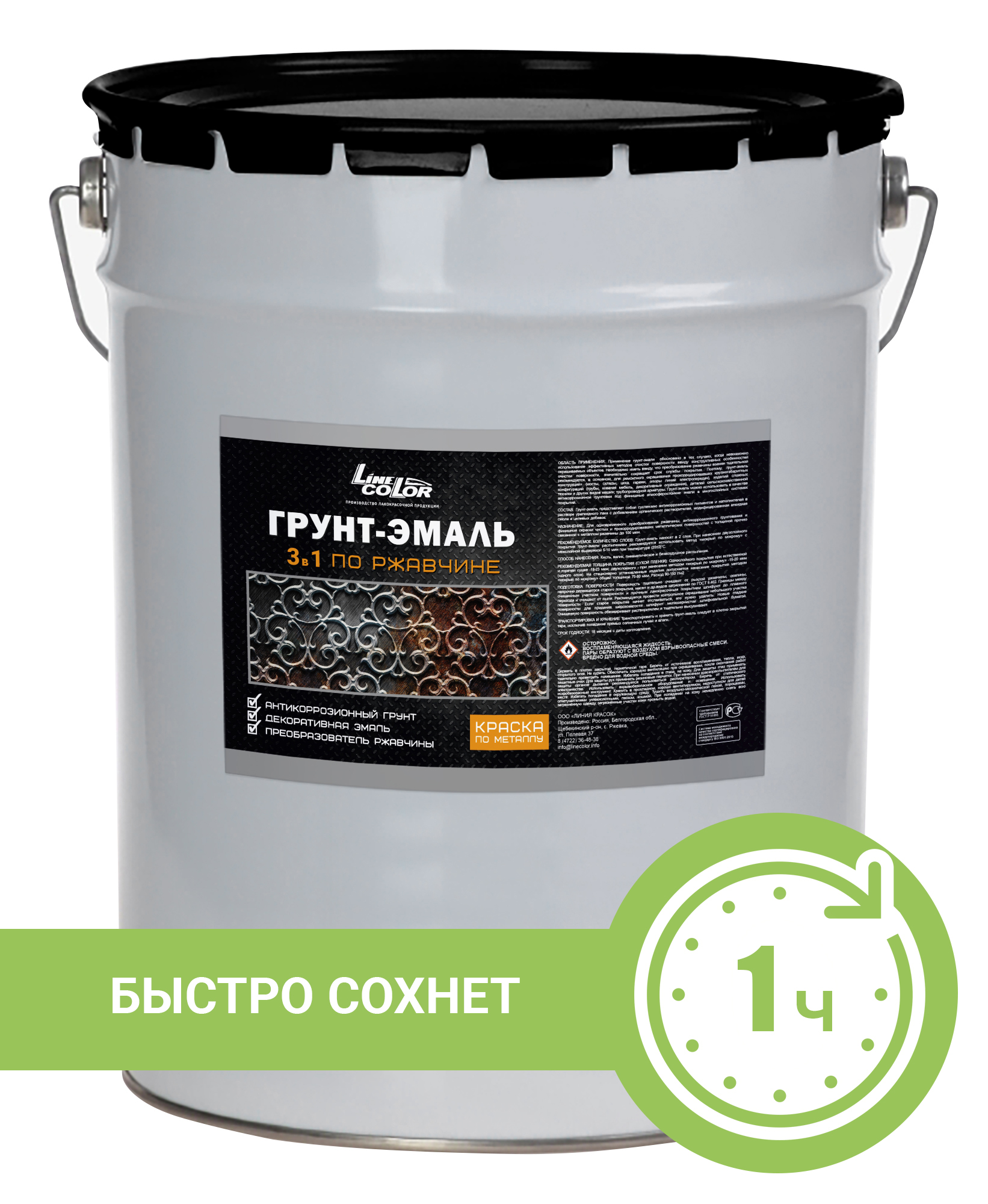 Грунт-эмаль 3в1 быстросохнующий антикорозийный по металлу с преобразователем ржавчины "LINE COLOR" (евроведро 20кг)